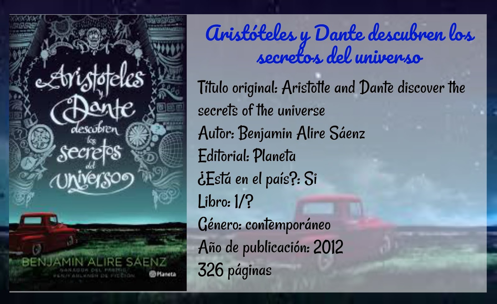 Aristóteles es introvertido y tímido. Dante es transparente y expresivo. Por motivos que parecen escapar a toda razón, estos dos chicos de diecisiete años se encuentran y construyen una amistad entrañable que les permitirá redefinir el mundo del otro y aprender a creer en ellos mismos para descubrir los secretos del universo. ☆☆☆☆