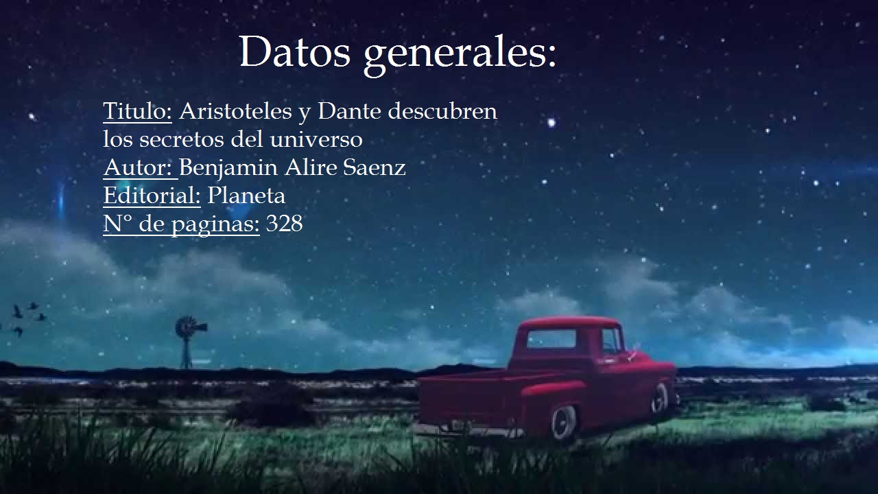 Sinopsis. Aristóteles y Dante descubren los secretos del universo es una cinta de drama, escrita y dirigida por Aitch Alberto ( Hara Kiri ), que sigue la historia de Aristóteles Mendoza, un joven mexico-estadunidense, que, en El Paso, Texas, en el verano de 1987, no tiene planes para tolerar las vacaciones. En los últimos meses, el joven se.