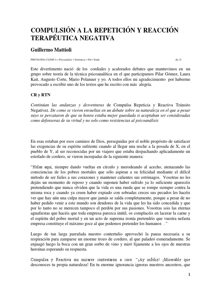 Compulsión a La Repetición y Reacción Terapéutica Negativa Psicoanálisis Verdad