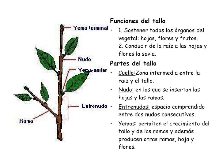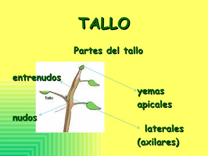 La estructura del tallo se divide en varias partes. De manera general y ordenada, se encuentran las siguientes partes de un tallo:. Cuello: esta parte se encuentra situada justo en la unión entre la raíz y el inicio del mismo. Nudos: son pequeños nódulos que aparecen a lo largo del tallo y que indican el nacimiento de las hojas. Entrenudos: son los espacios comprendidos entre dos nudos.