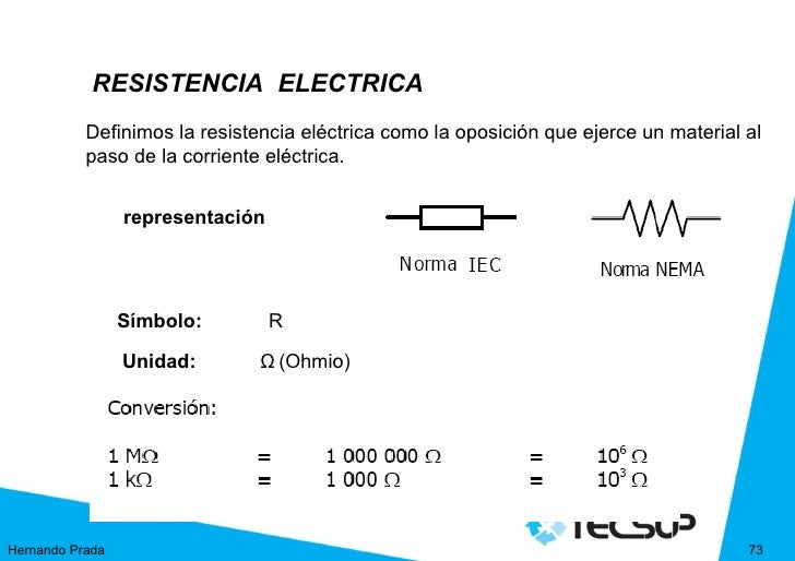 Se denomina resistencia eléctrica de un conductor a la oposición que ofrece dicho conductor al paso de la corriente eléctrica. Matemáticamente: R = ρ · l S. Donde: R es la resistencia eléctrica. Su unidad de medida en el Sistema Internacional (S.I.) es el ohmio ( Ω ). ρ es la resistividad del material.