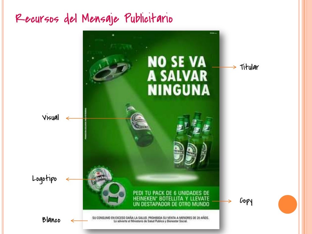 Por lo general, lo visual es impactante y, en muchos casos, dice más del producto que el resto de elementos del anuncio (bullet, contenido). Son de las partes más creativas de un anuncio publicitario, por lo que los publicistas ponen mucho énfasis en trabajarlas y conseguir que atraigan al mayor número de espectadores. Eslogan