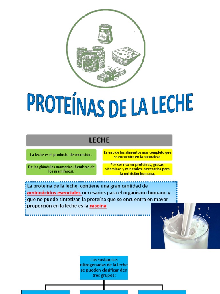 La leche es una fuente importante de proteínas, grasas, agua, lactosa, vitaminas y minerales. De estos, las proteínas de la leche son su componente más destacado, al ser macronutrientes esenciales para muchos procesos biológicos del cuerpo y con un gran aporte nutricional (FAO, s.f.).. Tipos de proteínas de la leche . La leche contiene dos tipos de proteínas: la caseína y la proteína.