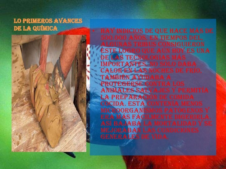 Primeros avances de la química . El principio del dominio de la química es el dominio del fuego. Hay indicios de que hace más de 500.000 años, en tiempos del homo erectus, algunas tribus consiguieron este logro que aún hoy es una de las tecnologías más importantes.No sólo daba calor en las noches de frío, también ayudaba a protegerse contra los animales salvajes y permitía la.