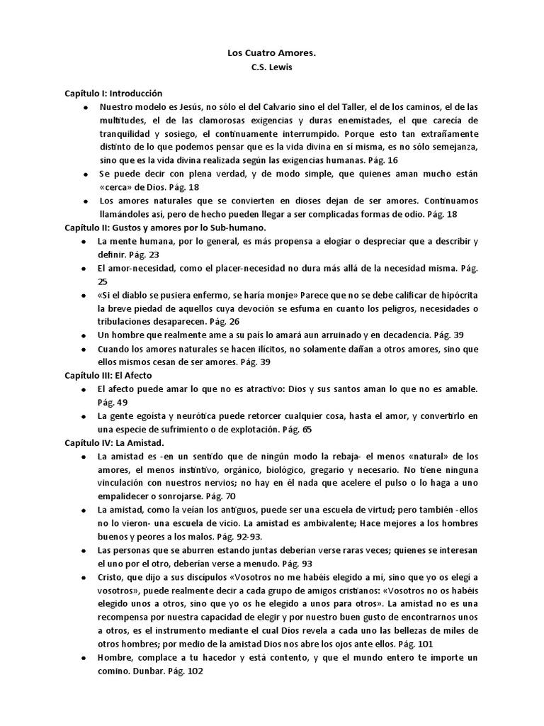 59,106 ratings2,869 reviews. C. S. Lewis refleja sobre los cuatro tipos básicos del amor humano -- el afecto, la amistad, el eros y la caridad. Explora la promesa y el peligro del amor entre padres e hijos; el amor que los hombres comparten con otros hombres y las mujeres con otras mujeres; el amor entre hombre y mujer; y el amor de y por Dios.