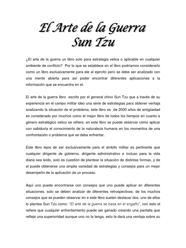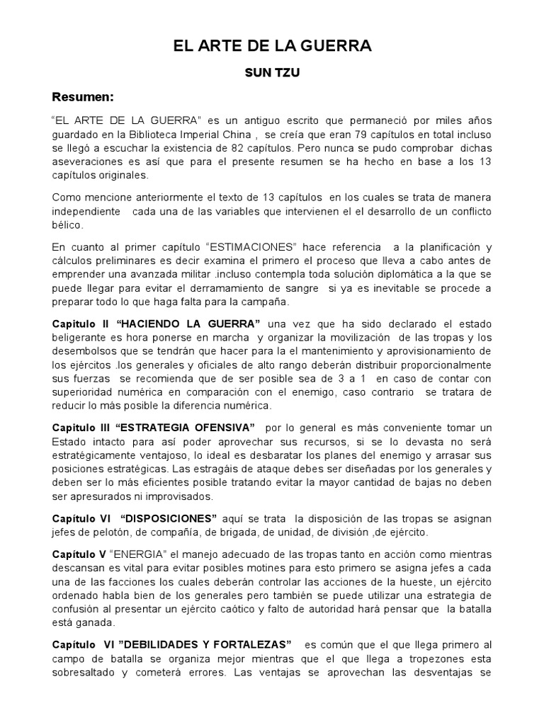 Resumen de El arte de la guerra, de Sun Tzu El arte de la guerra es un libro sobre estrategias y tácticas militares escrito por el estratega militar chino Sun Tzu en el siglo VI a.C. En esta corta obra de trece capítulos, Sun Tzu nos habla de cómo aplicar diferentes tácticas militares a los combates para asegurar la victoria. Su importancia ha sido tal que durante casi 1.500 años fue el.