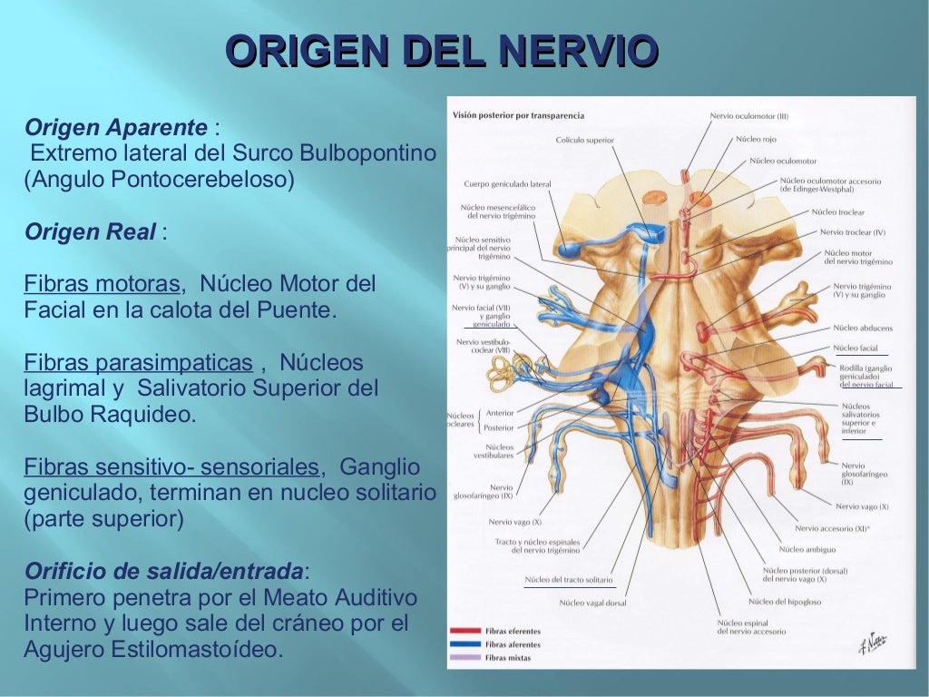 Origen real. El nervio facial consiste en dos fibras nerviosas, el nervio facial propiamente dicho y el nervio intermedio o intermediario de Wrisberg.El facial propiamente dicho tiene su origen en neuronas motoras del núcleo facial que está situado ventralmente en la porción inferior o caudal del puente troncoencefálico. [1] Los axones salen hacia atrás en dirección dorsal y medial hacia.