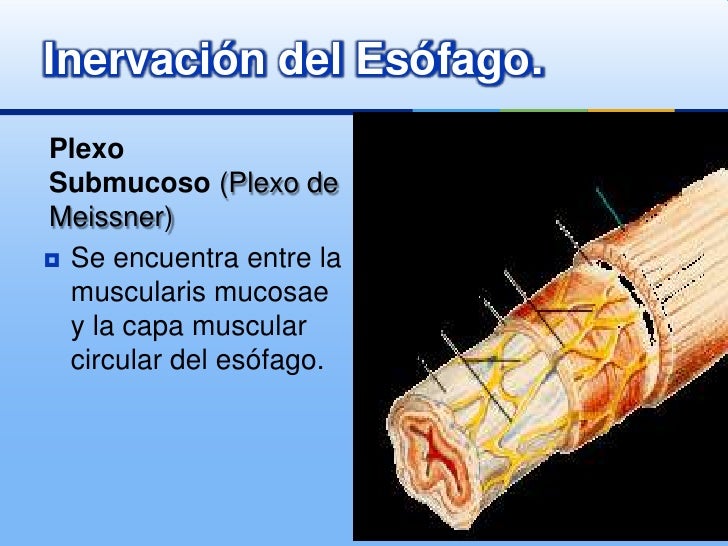 Plexo submucoso de Meissner. Se desarrolla en el intestino delgado y el colon principalmente, y se encarga de regular la digestión y la absorción en la música y los vasos sanguíneos. Plexo mientérico de Auerbach. Se se encuentra en todo el tubo digestivo, y se encarga de coordinar la actividad de las capas musculares de dicho órgano.