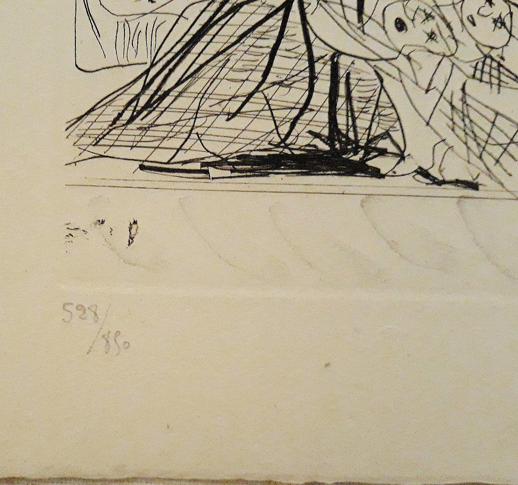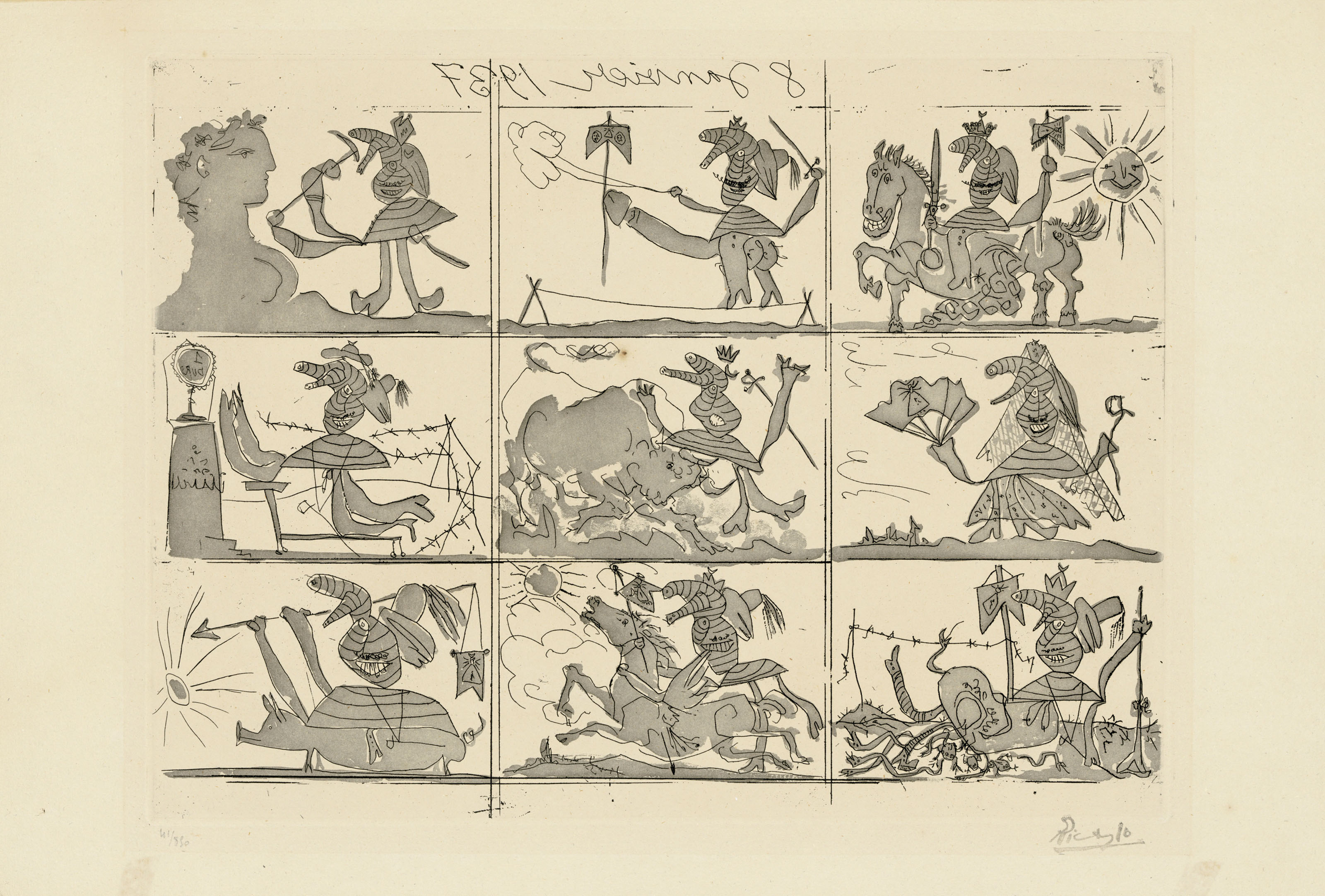 Sueno y mentira de Franco, the 'dream and lie of Franco', was created in 1937 in protest of Franco's coup d'etat a year earlier. Rather than simply condemn the unlawfulness of this regime, Picasso chose to at once ridicule the general and expose the suffering of the people in a series of 18 cartoon-line scenes printed from two plates.